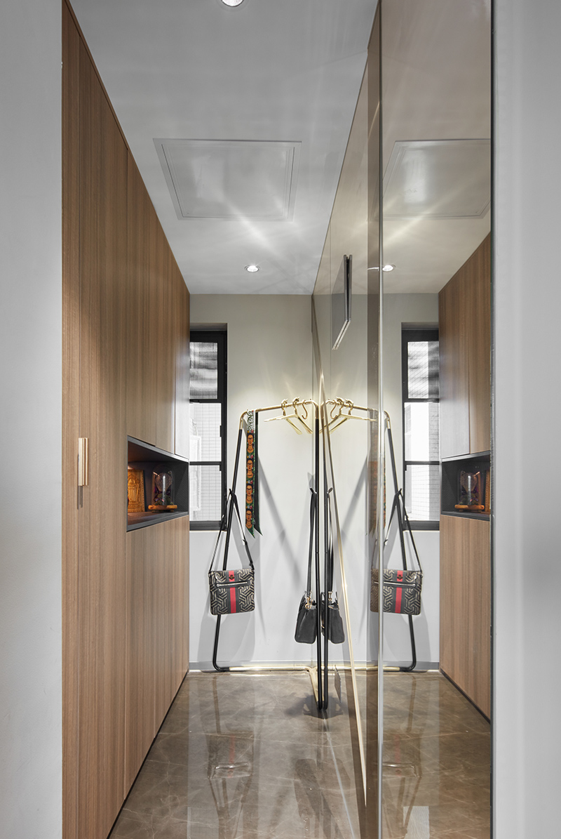 淺色木紋衣柜造型簡約,獨特的內嵌設計更具觀賞性。