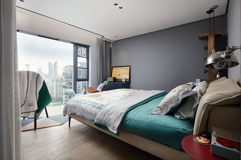 臥室大方簡潔、大面積落地窗擁攬絕佳的視野與采光,