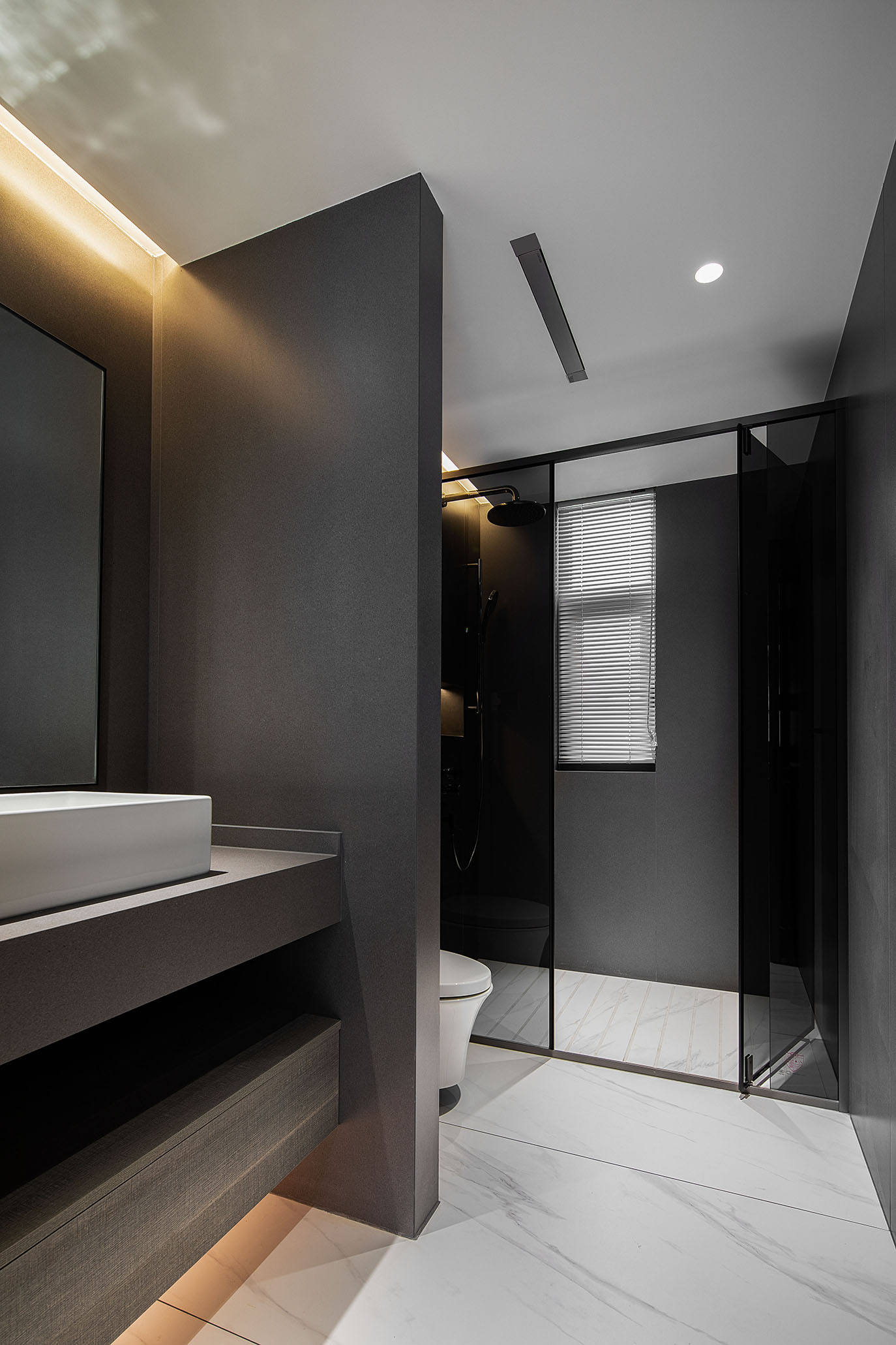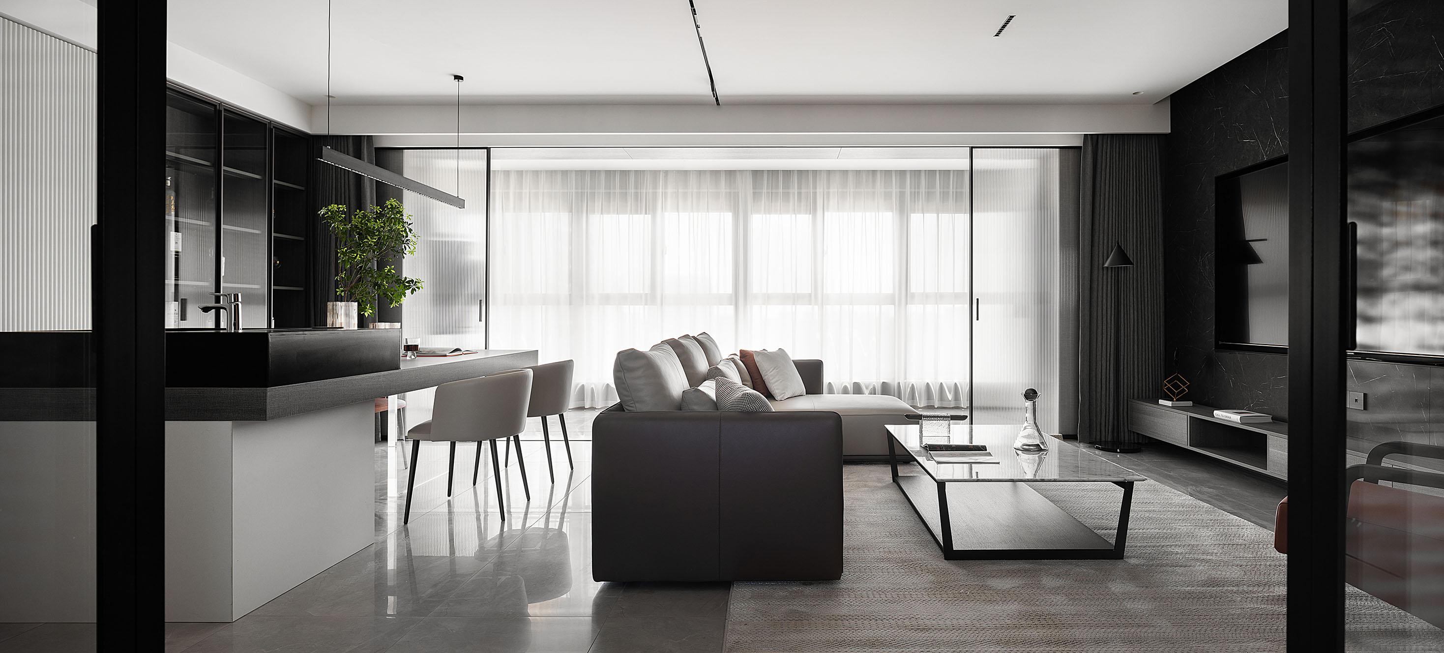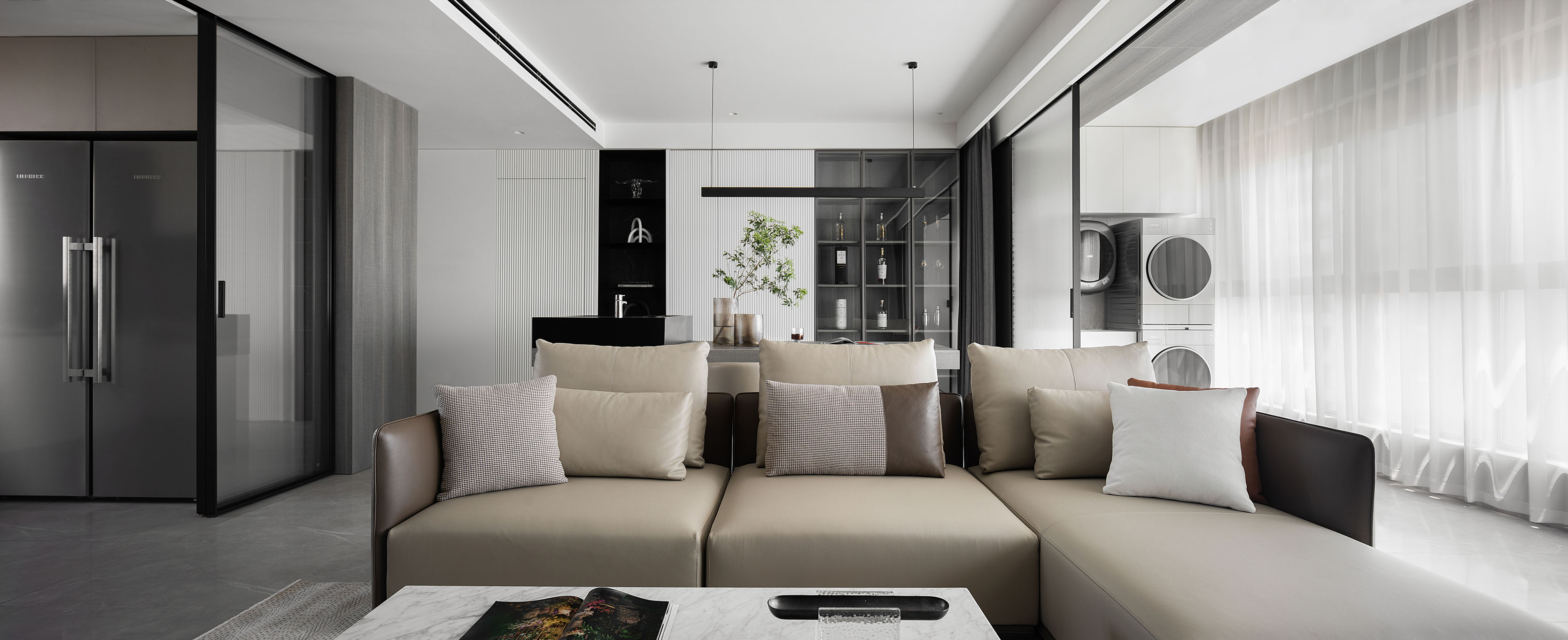 逼真的高級灰大理石紋理、柔和的駝灰色沙發、隔而未隔的鋁框玻璃移門,
