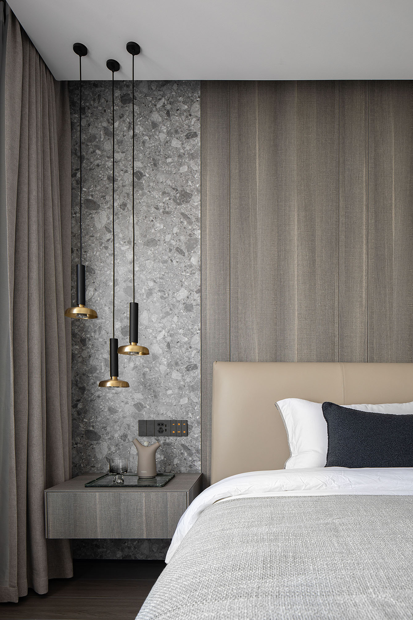 搭配白色電視柜、灰色棉麻質地的床品,
