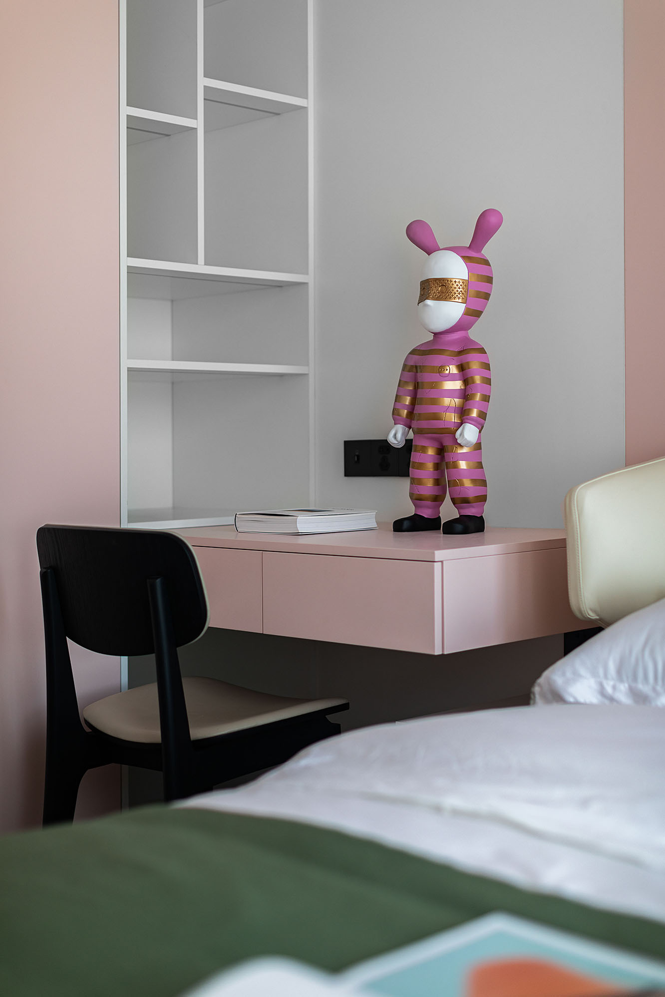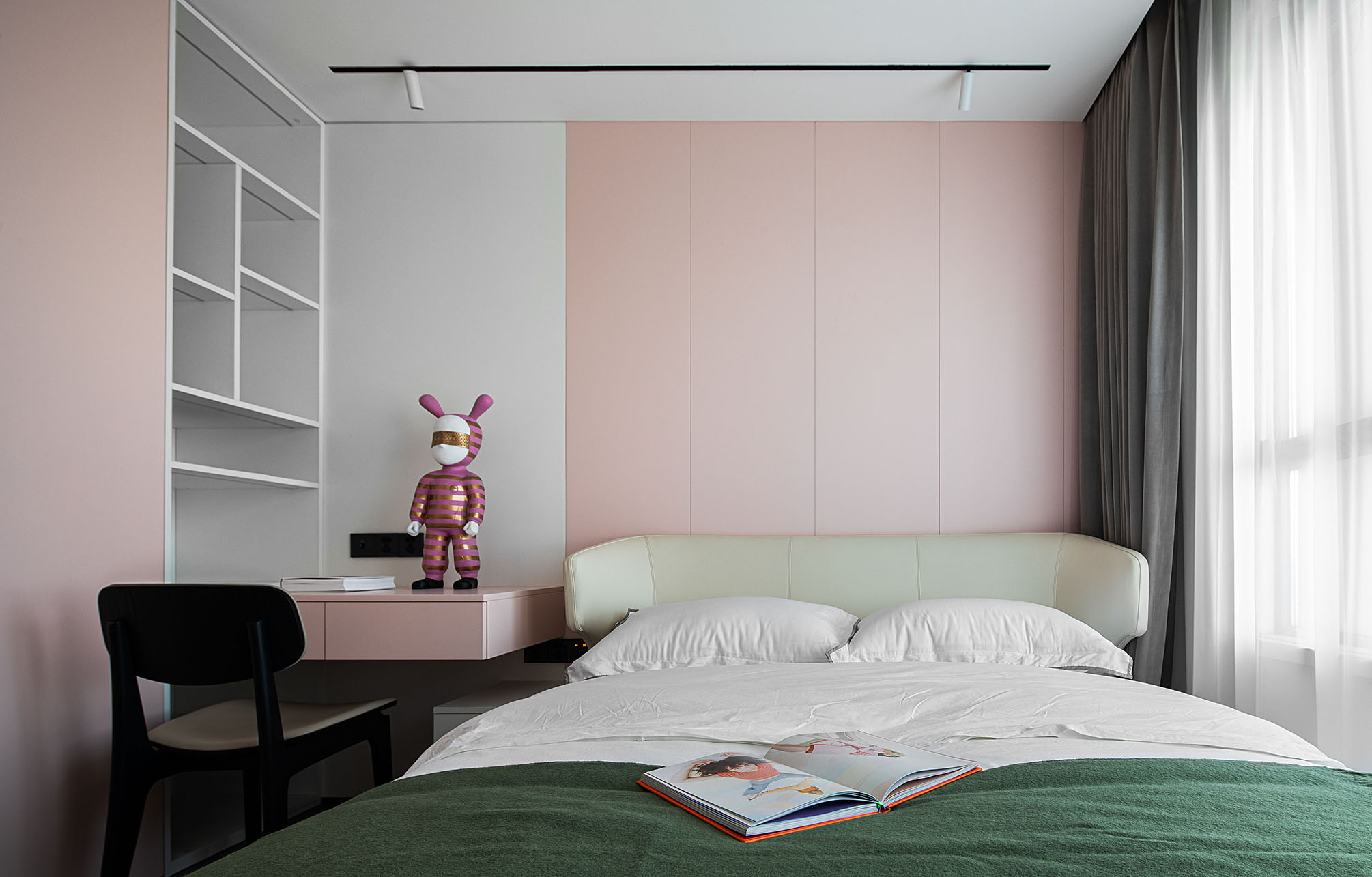 墨綠的撞色讓房間顯得更為活潑,粉色玩偶充滿了童稚氣息。