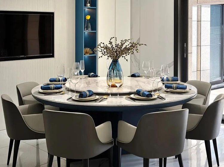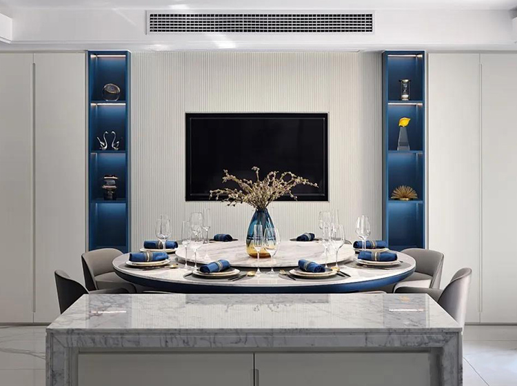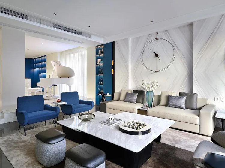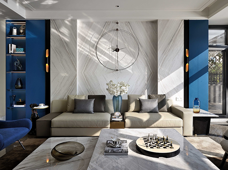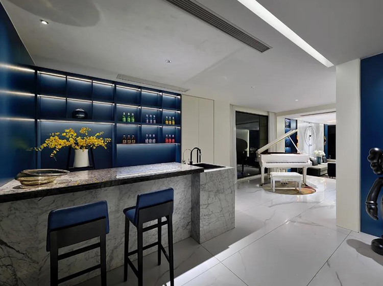 藍色與大海、晴空等自然景觀能夠產生強烈的關聯,墻體純潔的乳白色與護墻板的海藍色進行碰撞,形成強烈的視覺效果,大理石紋做些許點綴,清新優雅,仿佛平靜的藍色海面上泛起層層浪花。