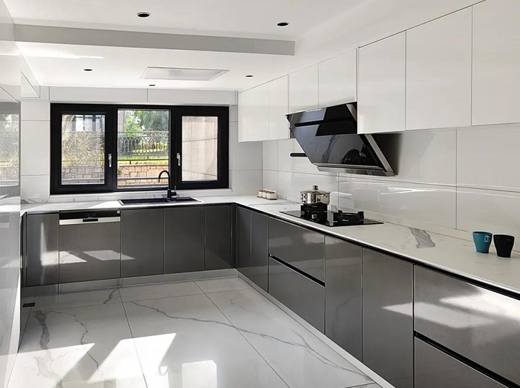 櫥柜的設計將極簡發揮到了極致,灰色金屬烤漆搭配大理石紋顯得素凈且時尚,充滿現代氣息。