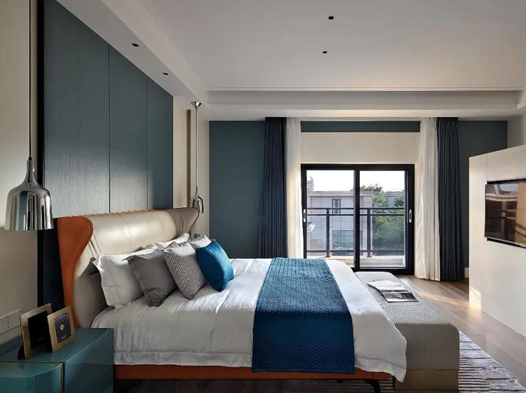 藍色能輕松應用于多種不同的材質、紋理及表面效果上,既能表達傳統與優雅,也能給人帶來大膽的驚喜。拉絲紋理護墻就體現了不規則的光澤,讓整面護墻充滿靈動氣息。床體鑲邊的明艷橙色,裝飾品高貴的藍絲絨,都給居住者以安全感,為心靈帶來平和與寧靜,提供庇護。