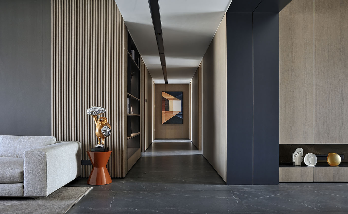 本案用淺深灰、橡木擦色為主色,以橙為點綴色來塑造不同空間的點線面和調(diào)性,