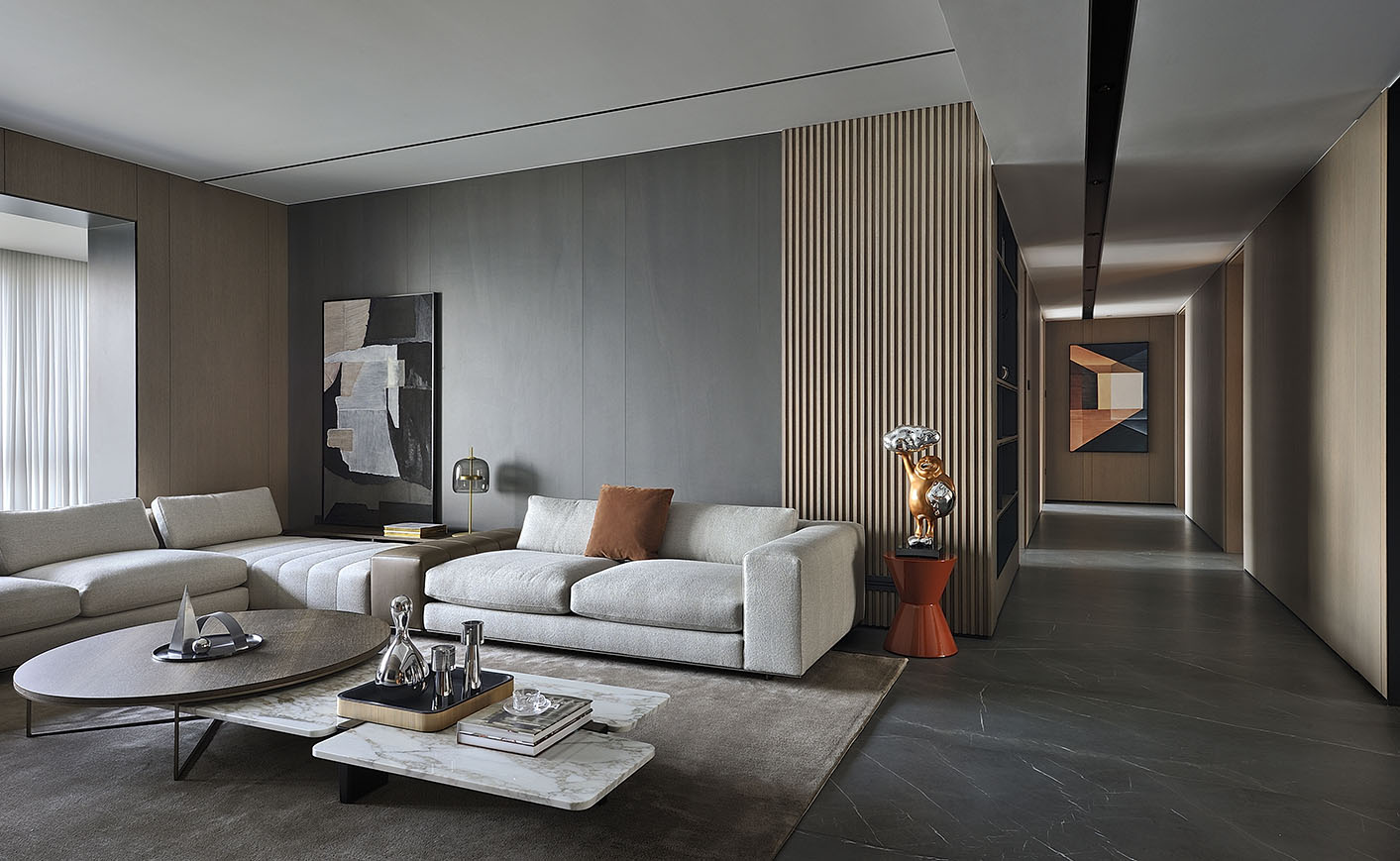 灰色板點綴著橡木格柵,整體線條簡約硬朗,