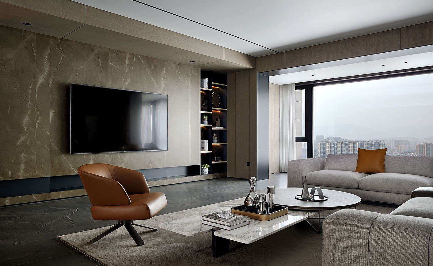 電視背景墻以大理石為主元素,