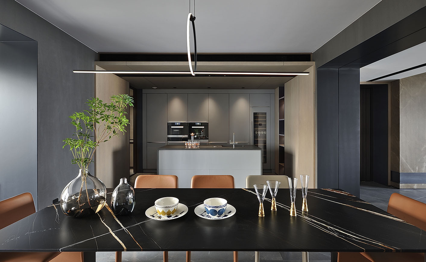 橙色餐椅的點綴給原本冷靜的空間注入了溫度,
