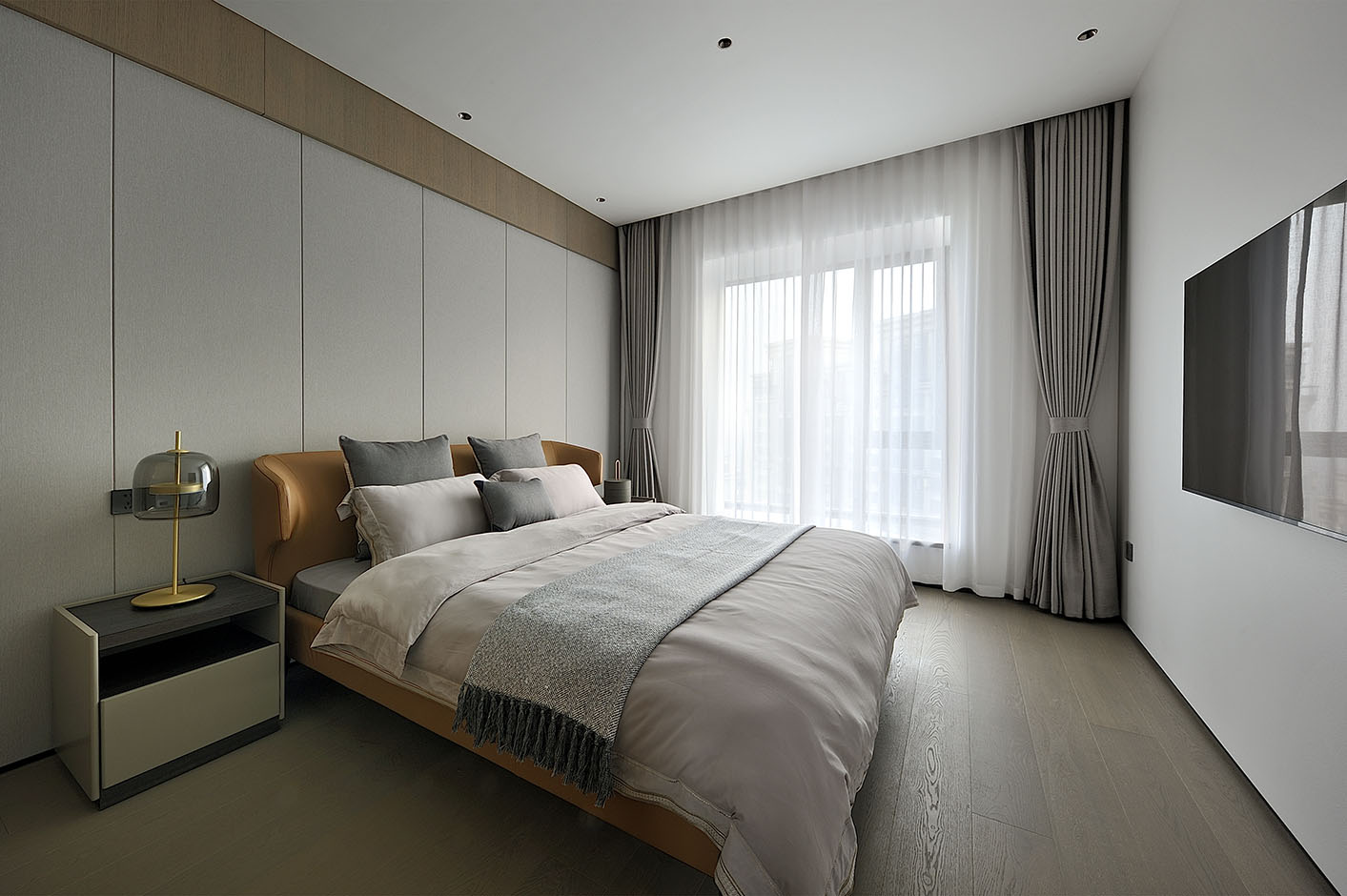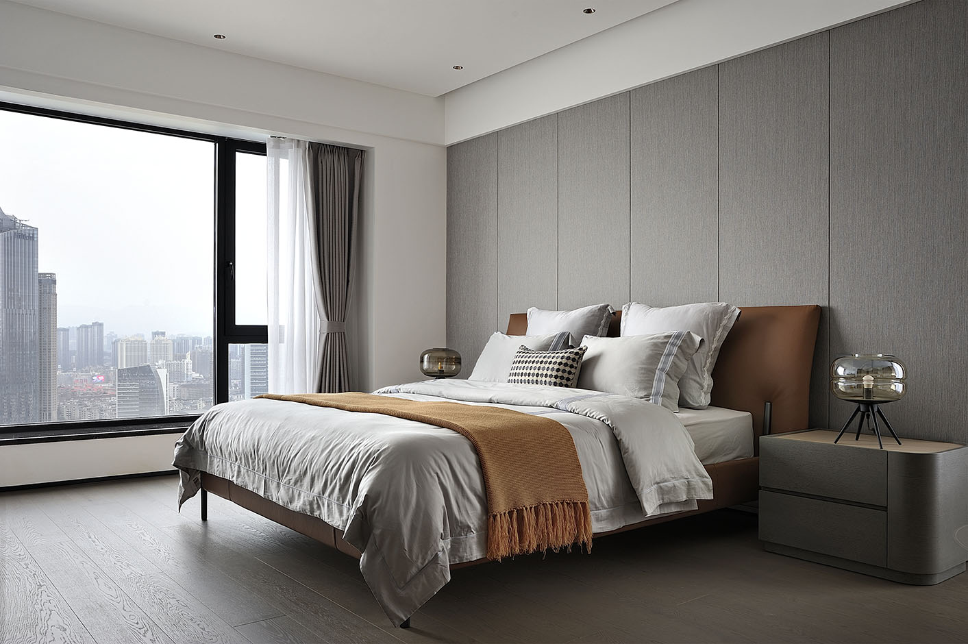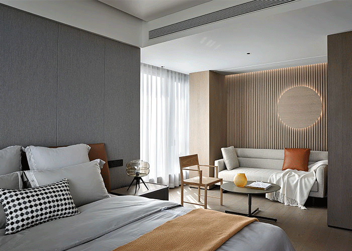 遵循給主人優(yōu)質(zhì)睡眠質(zhì)量的設(shè)計主旨,臥室的設(shè)計籠罩著淡淡“夕陽”的色調(diào),