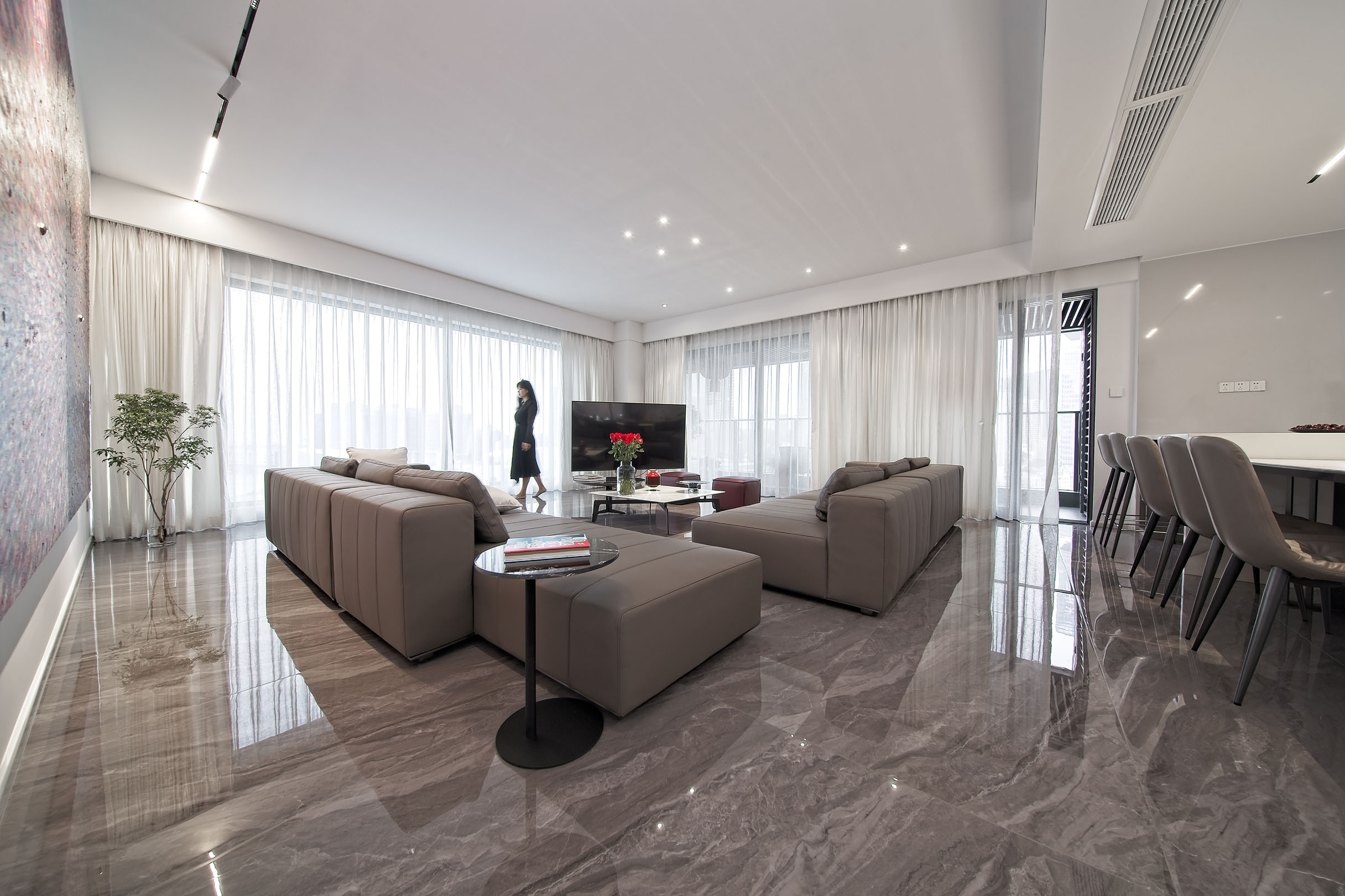 本案將客廳、餐廳、廚房全部打通,從進(jìn)門即能一眼驚艷。