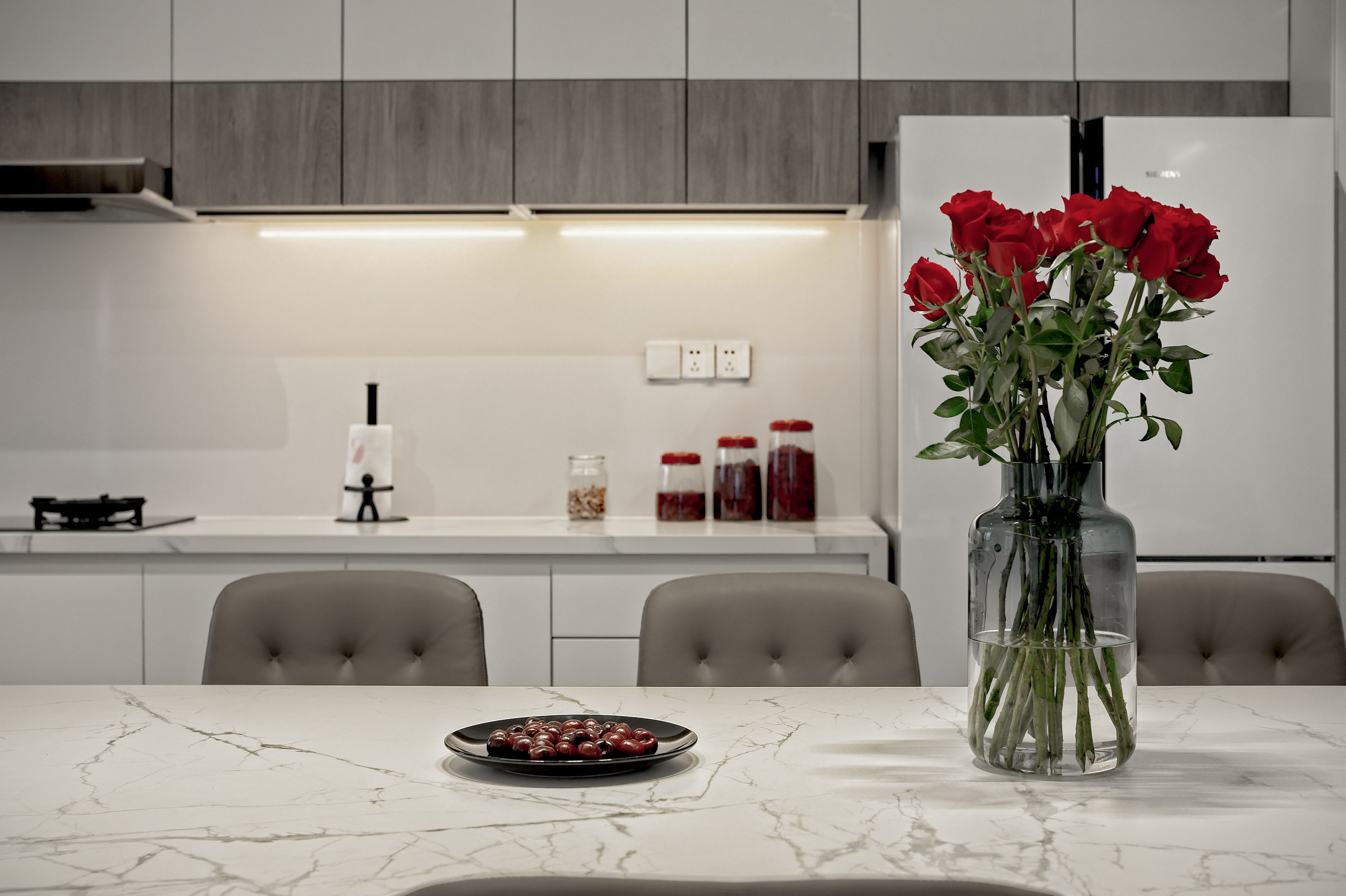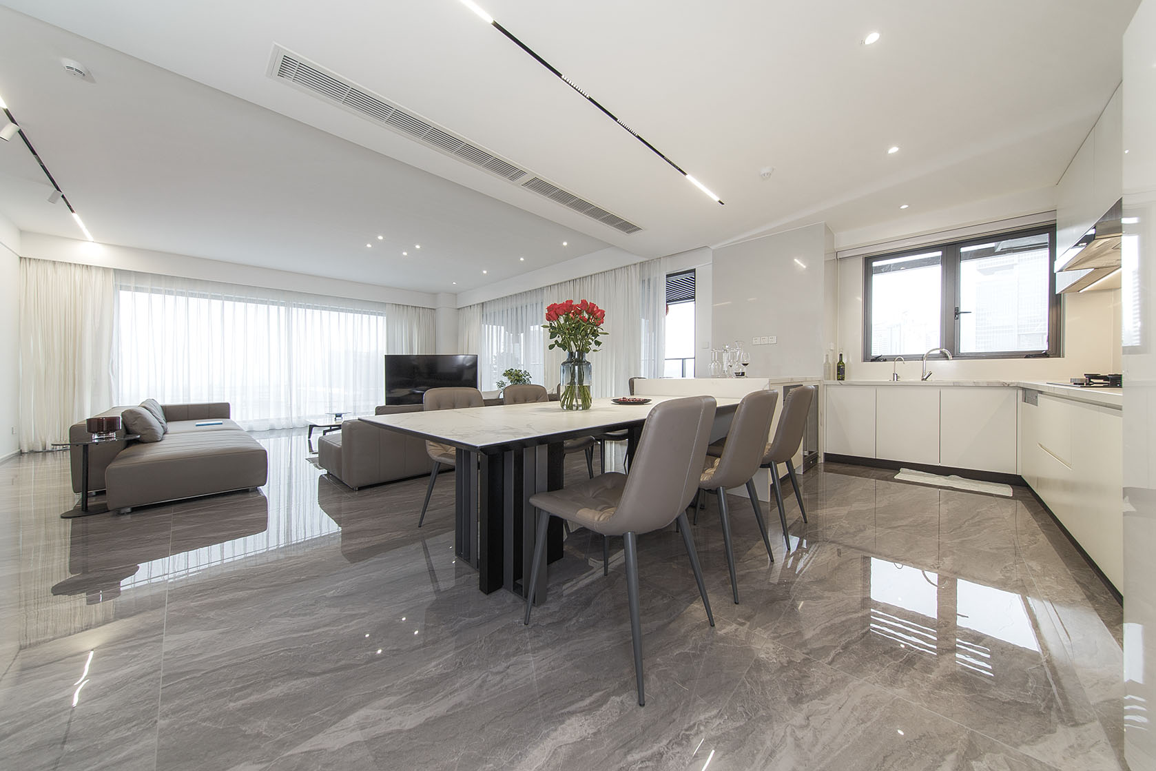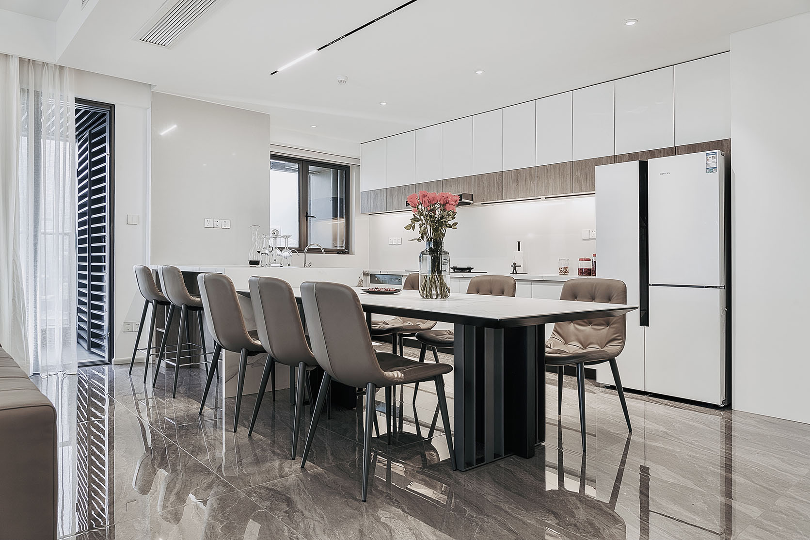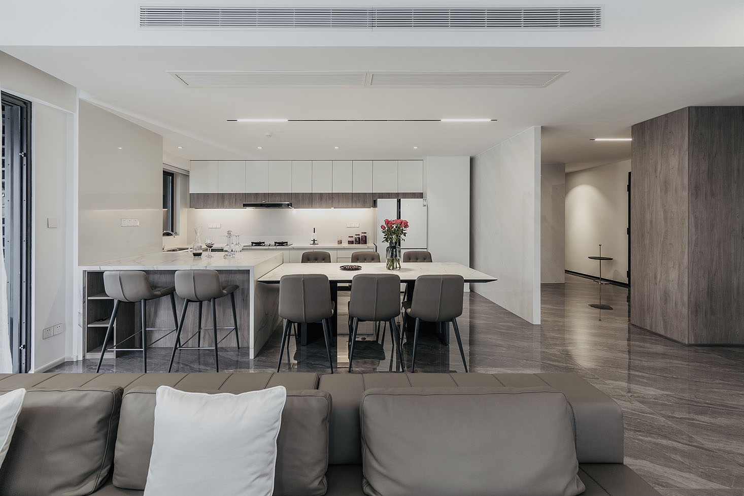 灰花白大理石紋的西廚島臺(tái)和灰色皮質(zhì)餐桌椅相互映襯,展開在石影木色中,