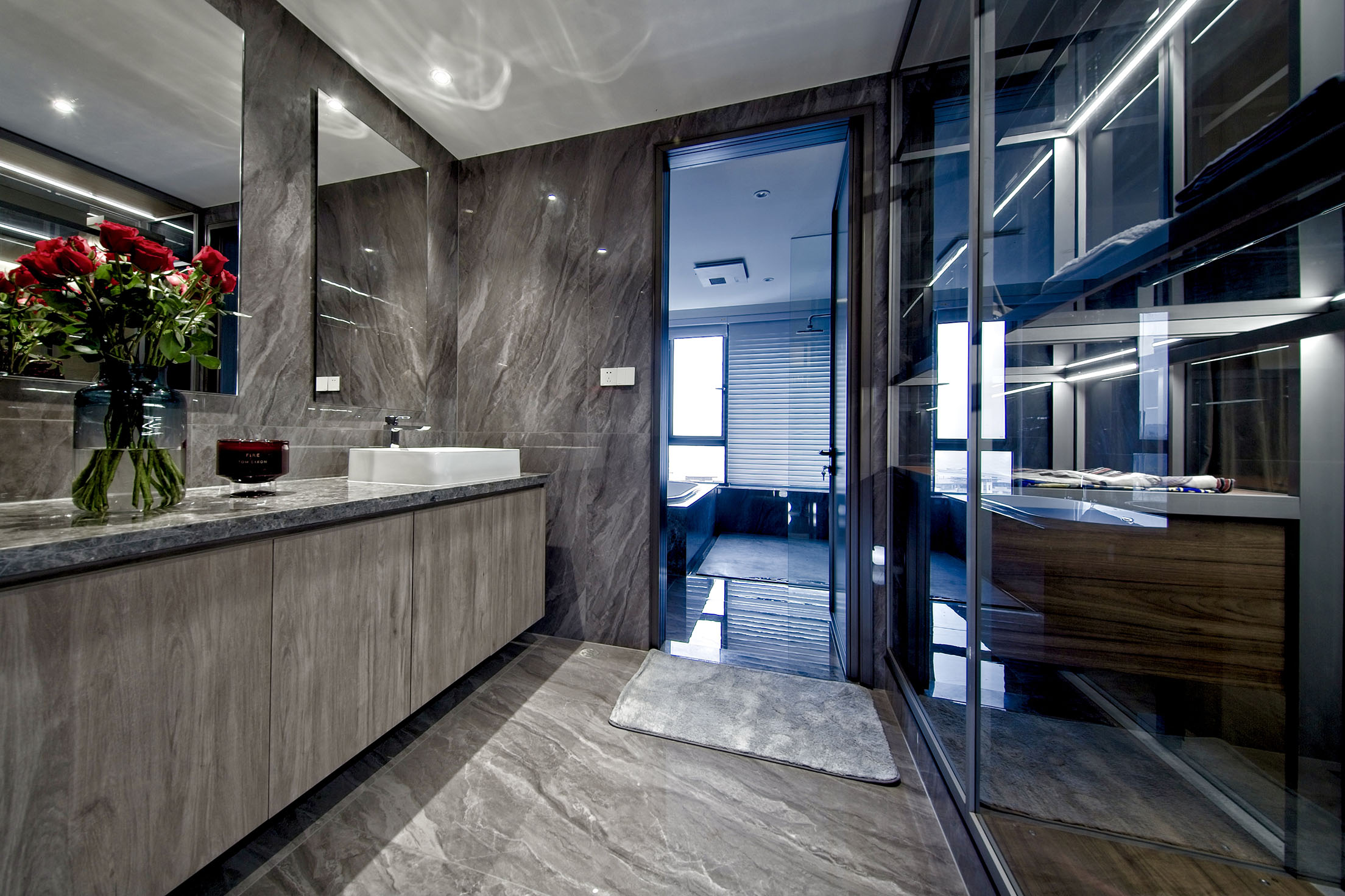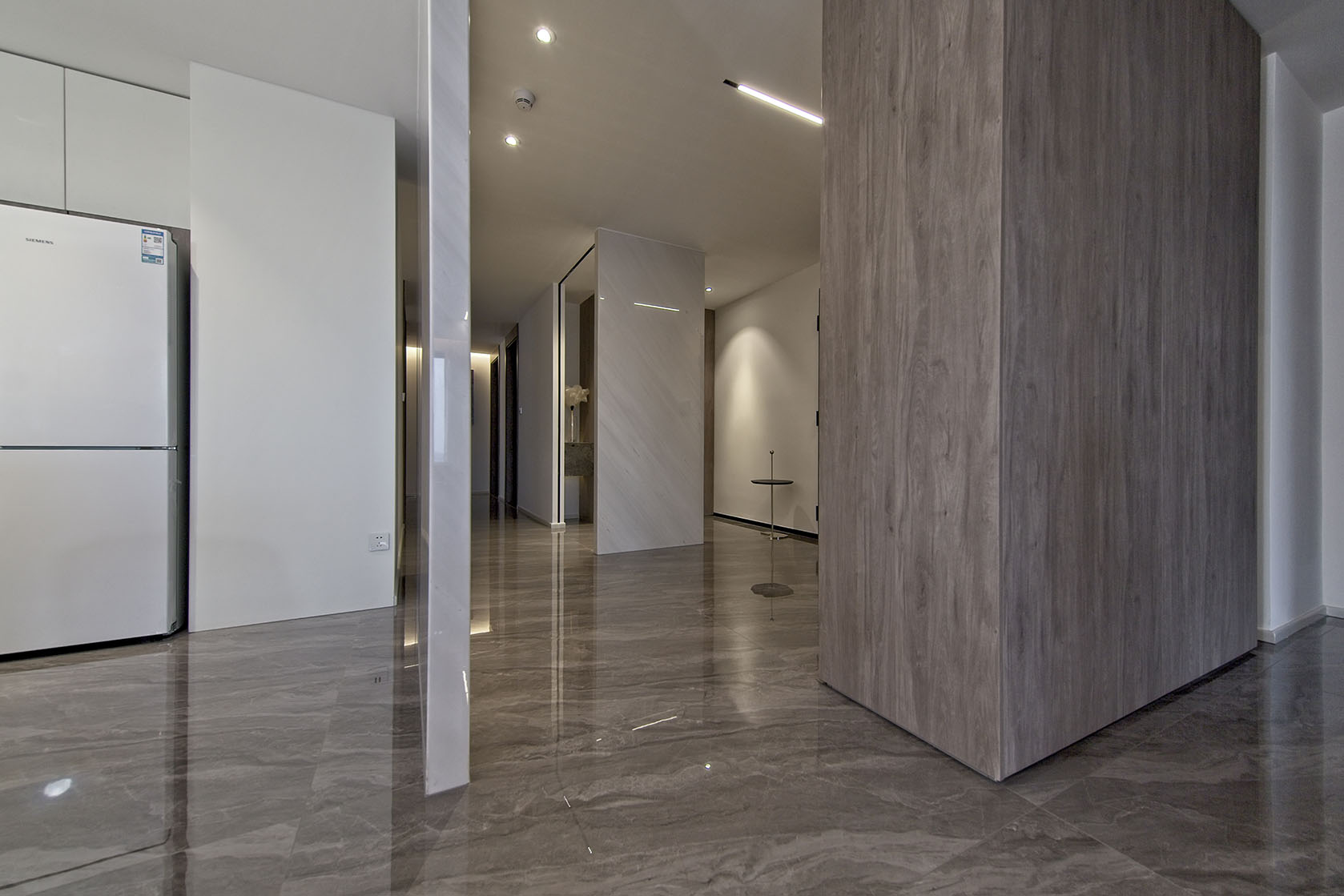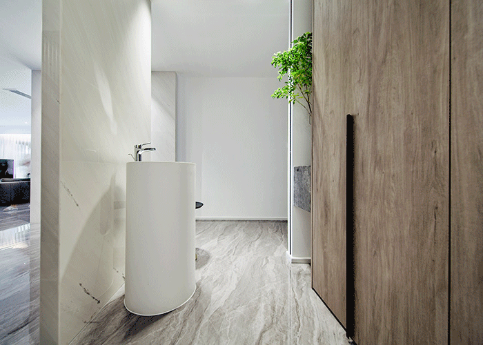 大面積灰色紋理搭配白色大理石巖板,巧設(shè)隔斷,