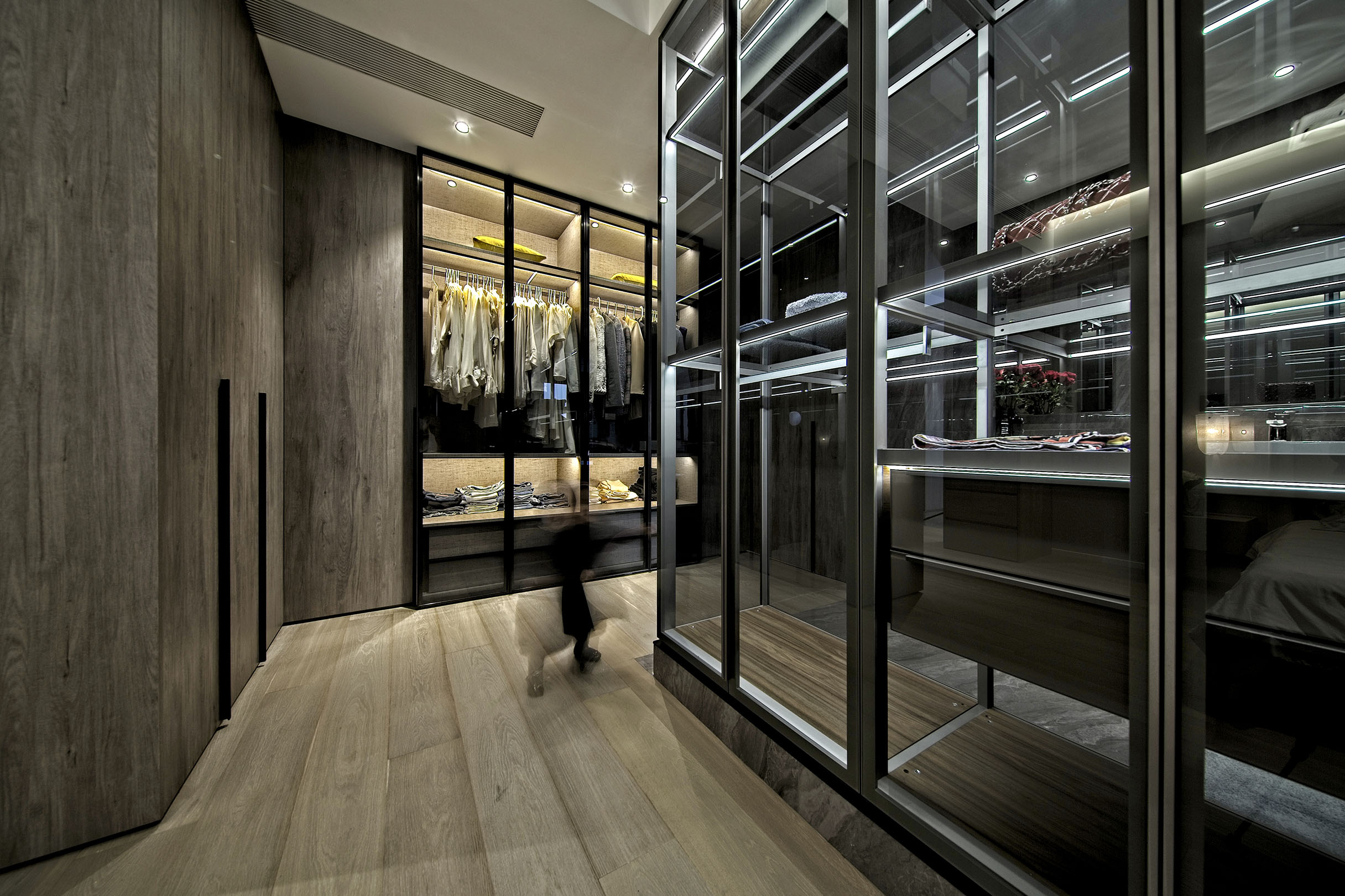 通高的玻璃柜簡約大氣,層板燈的烘托讓其極具通透感,