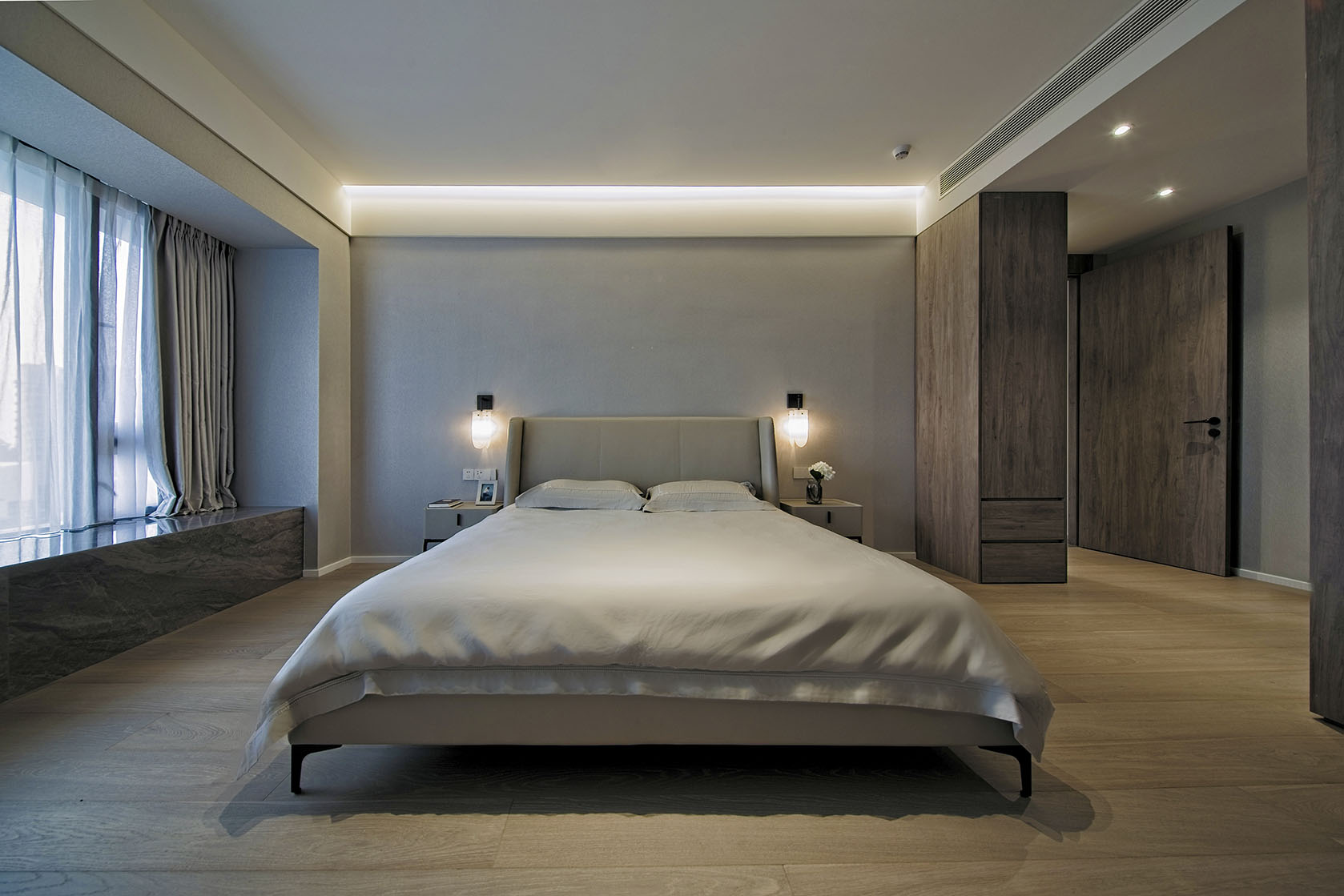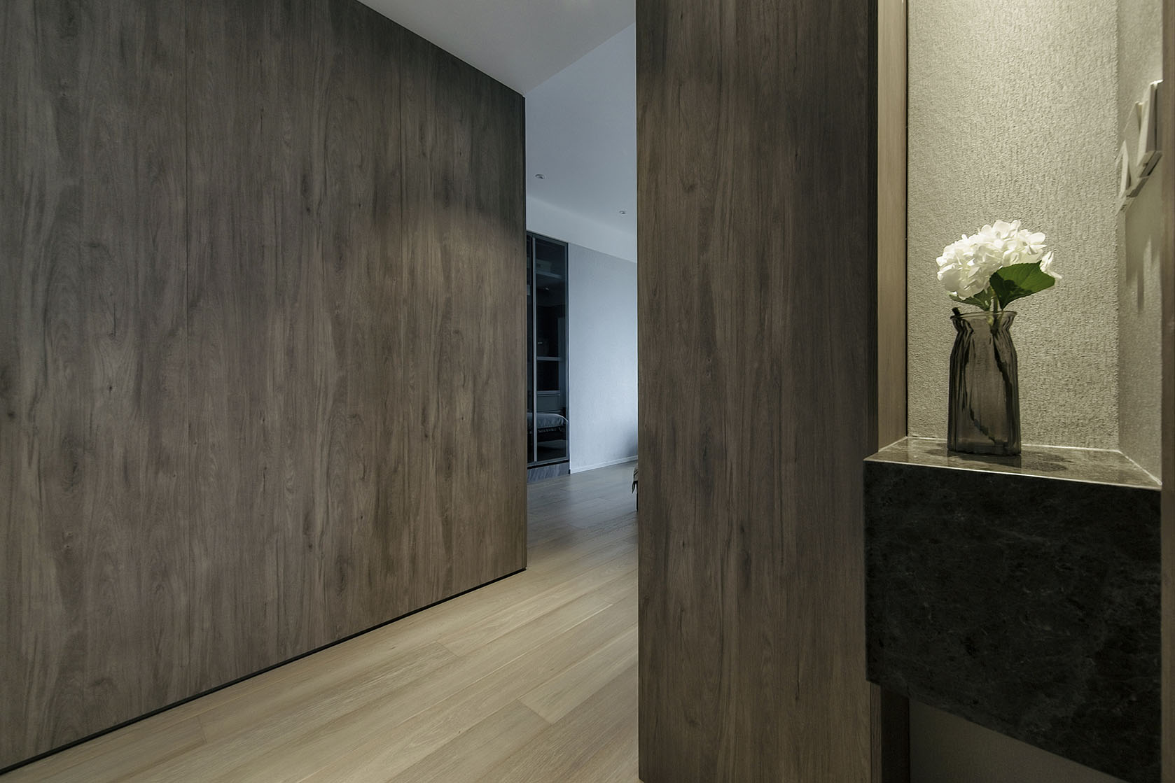 但在這套設(shè)計(jì)中,設(shè)計(jì)師通過深與淺的灰色搭配出了層次感,并利用木元素的自然,讓灰色空間也擁有溫馨與舒適。