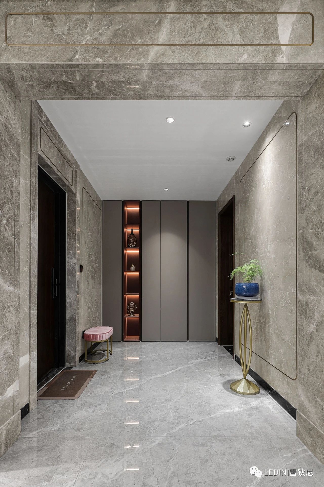 玄關處用天然大理石鋪設,入戶即感受到整個空間的華美,