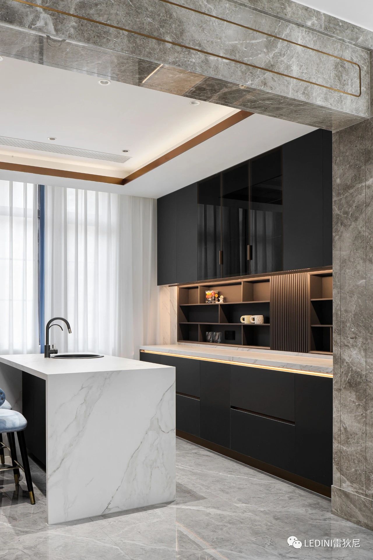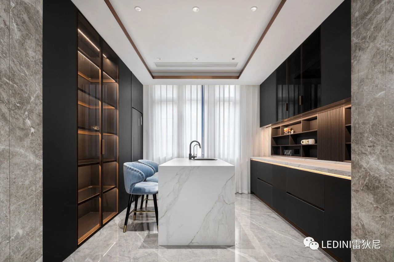 本案中,設計師主要選用雷狄尼進口烤漆搭配天然的大理石紋,