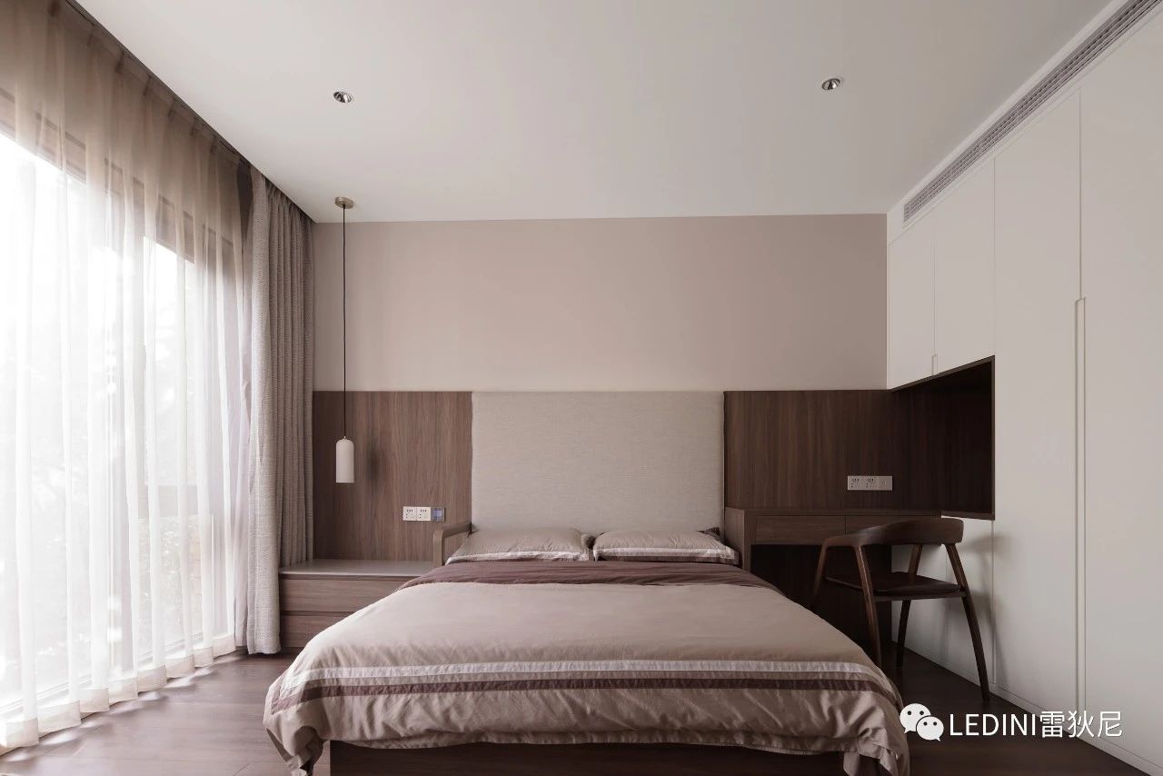 素雅的空間中,居于正中位置的大床覆蓋著柔軟的床品,造型簡單的懸空床頭柜,別致的氛圍燈,