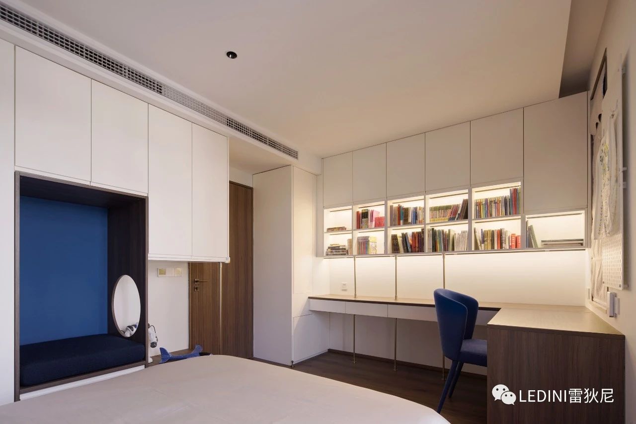 簡約又富有細節,設計師采用白色和藍色的色彩對比法,
